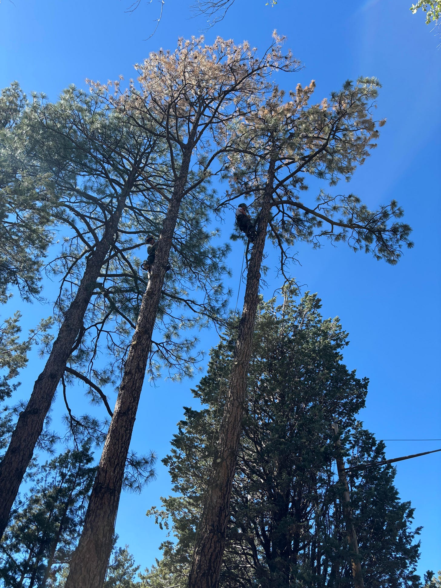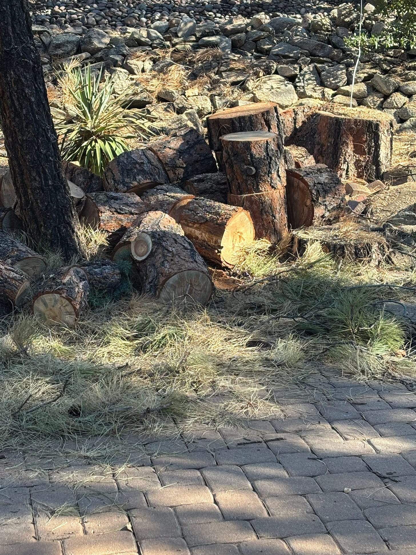I’m watching trees fall, six majestic ponderosas, no doubt planted around 1958 when this house was born. They’ve survived the drought until this year when the bark beetles bore through their outer shell to the inner bark where they gorged on soft tissue eventually cutting off the flow of nutrients from the leaves to the other parts of the tree. That’s the extent of my knowledge, basically the poor creatures were strangled from within, victims of the drought, victims of climate change.